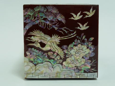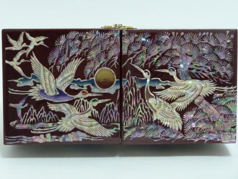 商品全面に鶴と松ノ木の螺鈿細工が贅沢に施された宝石箱です。