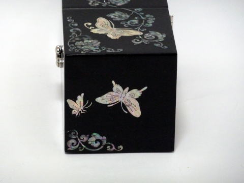漆塗装の本体に蝶の螺鈿細工が贅沢に施された宝石箱です。