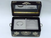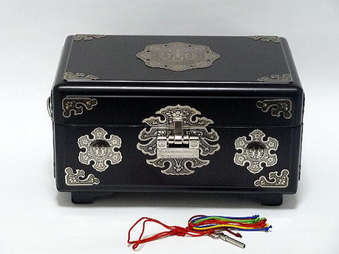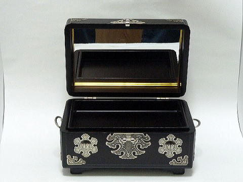 ズッシリとした木製箱に白銅が装飾されたとても豪華で高級感が有る宝石箱で、末永くご利用頂けます。