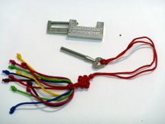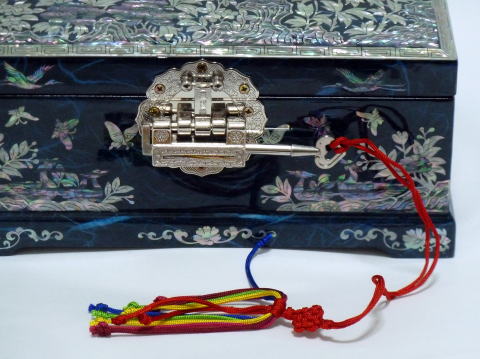 宝石箱の開閉は、付属のストラップが付いた鍵を錠の右横の挿入口から押し込めば簡単に開きます。