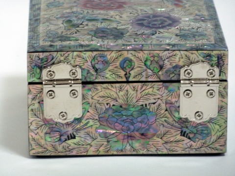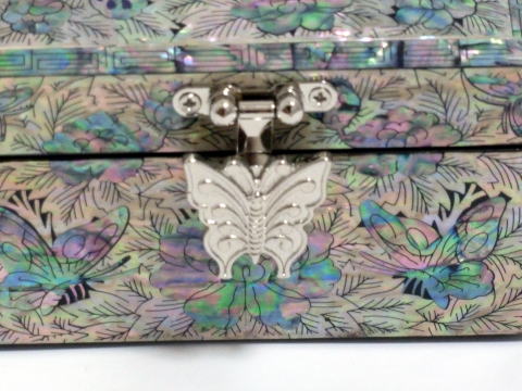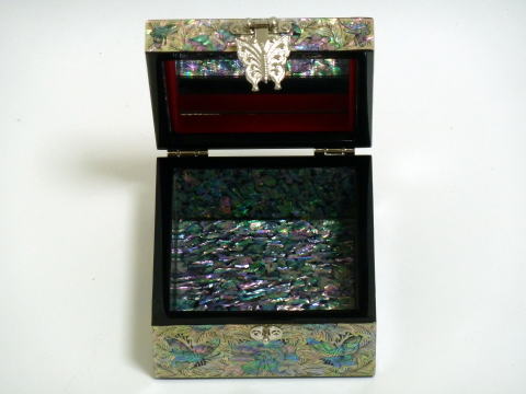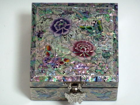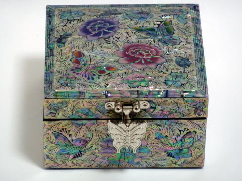 花と蝶の螺鈿細工が正方形の宝石箱にぎっしり散りばめられています。