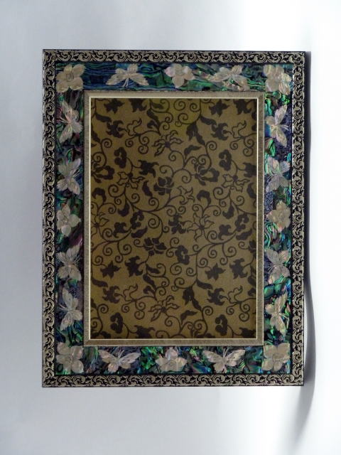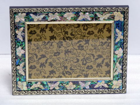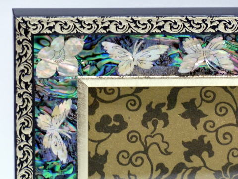 写真立てのフレーム部分が蝶模様の螺鈿細工で作られたおしゃれでゴージャスな商品です。