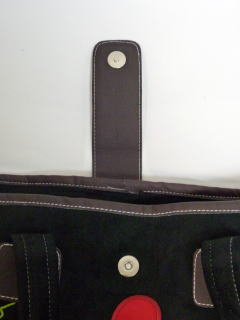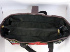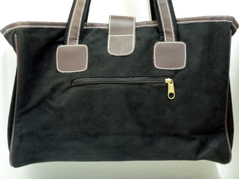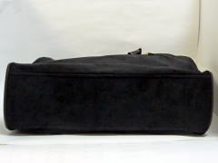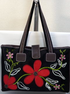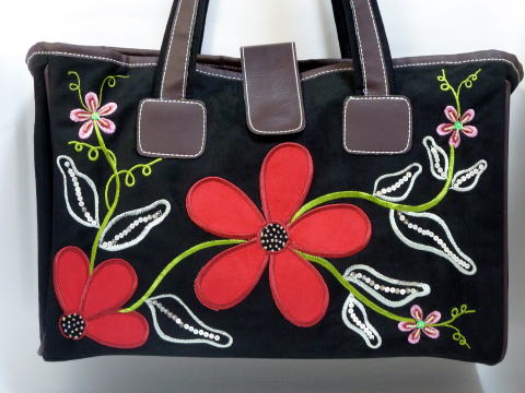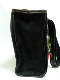 黒色のスエード地本体に大きな花びらのアップリケ、刺繍が施されたされたトートバッグです。